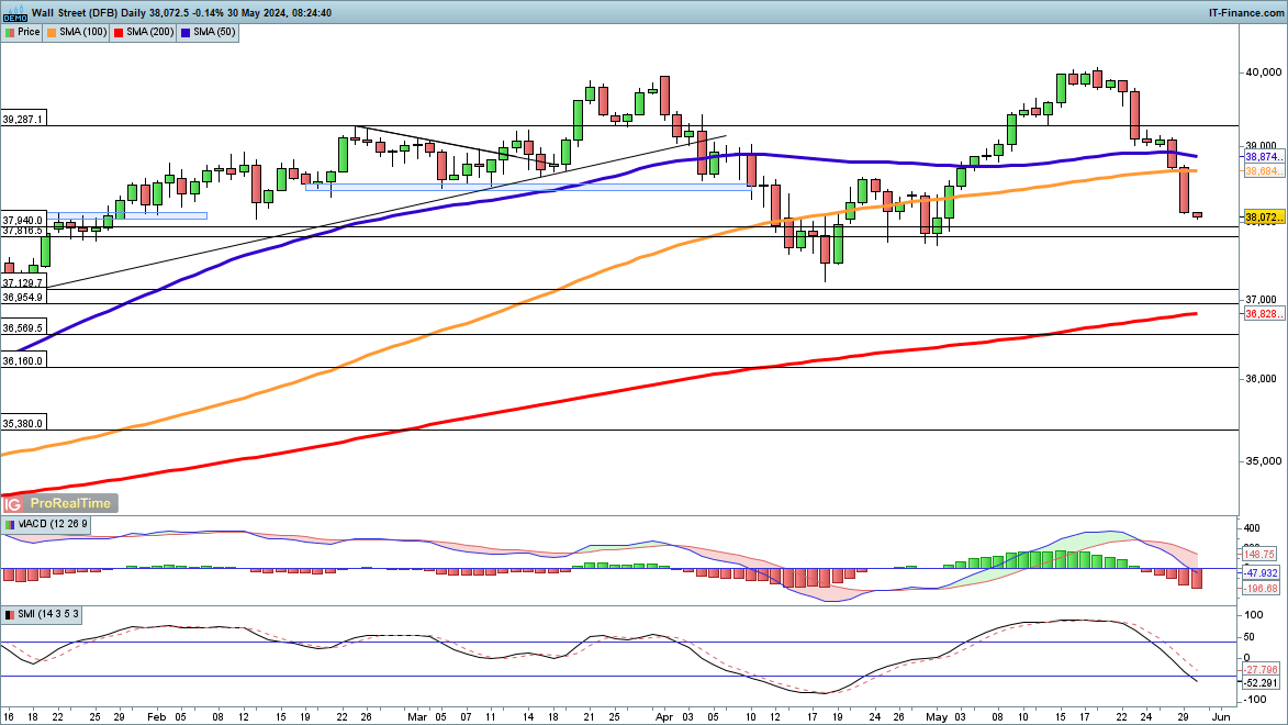 The Dow Jones index has surrendered most of its gains from the beginning of May, dropping 2000 points in just two weeks. This sharp decline has shifted the outlook from short-term bullish to one of near-term caution. Buyers previously entered the market above 37,000 in mid-April and around 37,850 at the end of the month, indicating these levels might offer some support. A close below the mid-April low could prompt the index to test the 200-day simple moving average (SMA) for the first time since November.