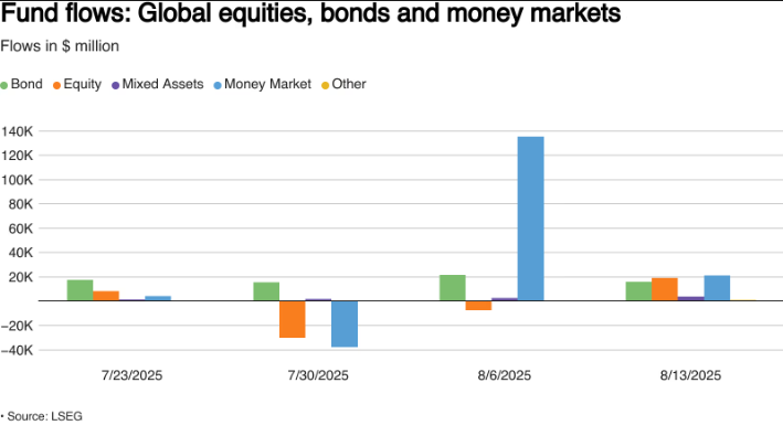 Global equity funds saw their biggest weekly inflows in six weeks by August 13, thanks to lower-than-expected U.S. inflation and a tariff truce between the U.S. and China, which boosted investor confidence.