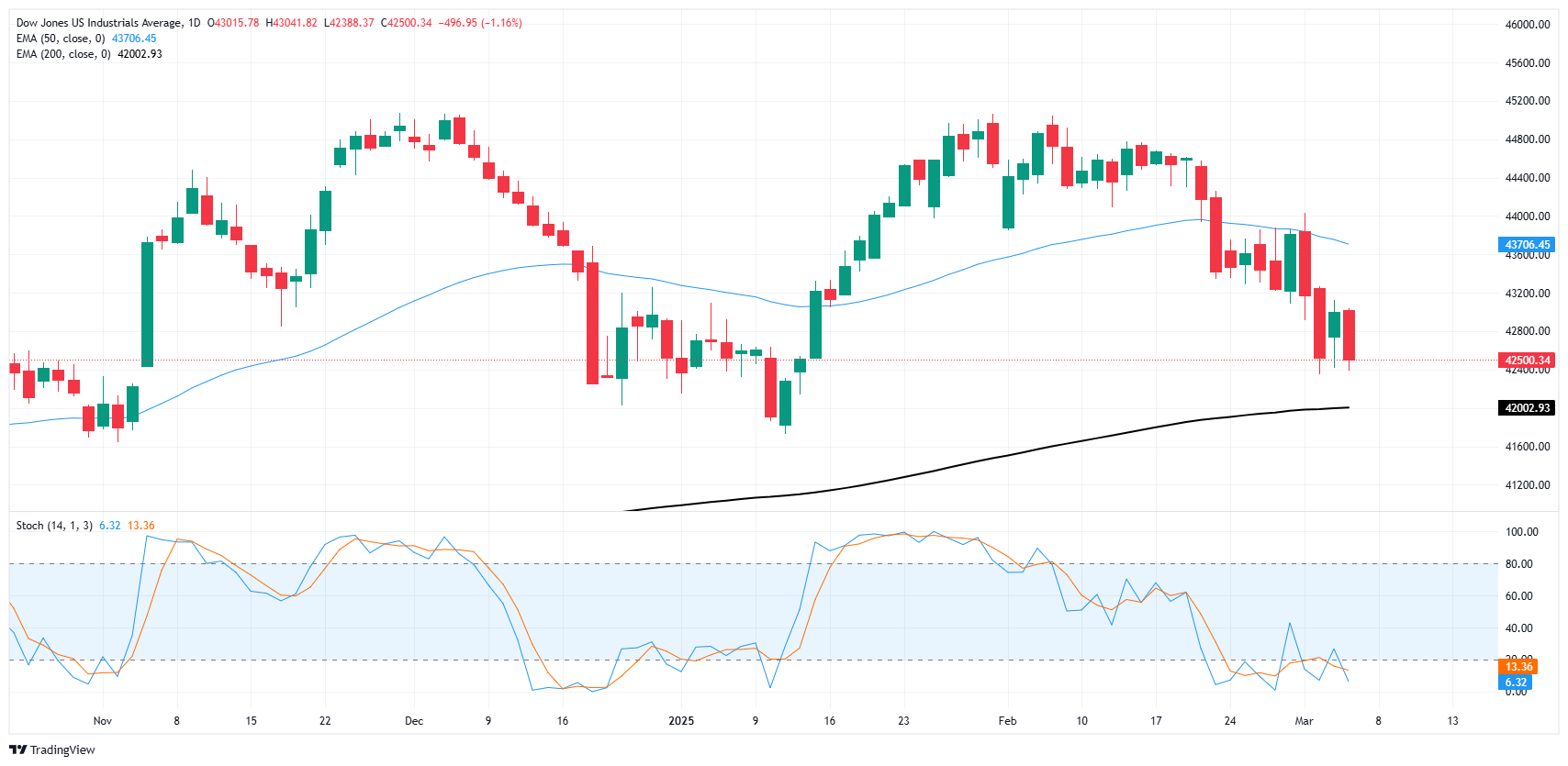 The Dow Jones is poised to make contact with the 200-day Exponential Moving Average (EMA) near the 42,000 key figure, but only if selling pressure is able to push bids down another 500 points, a move that would likely require a shift in fundamentals… or a bad employment data print.