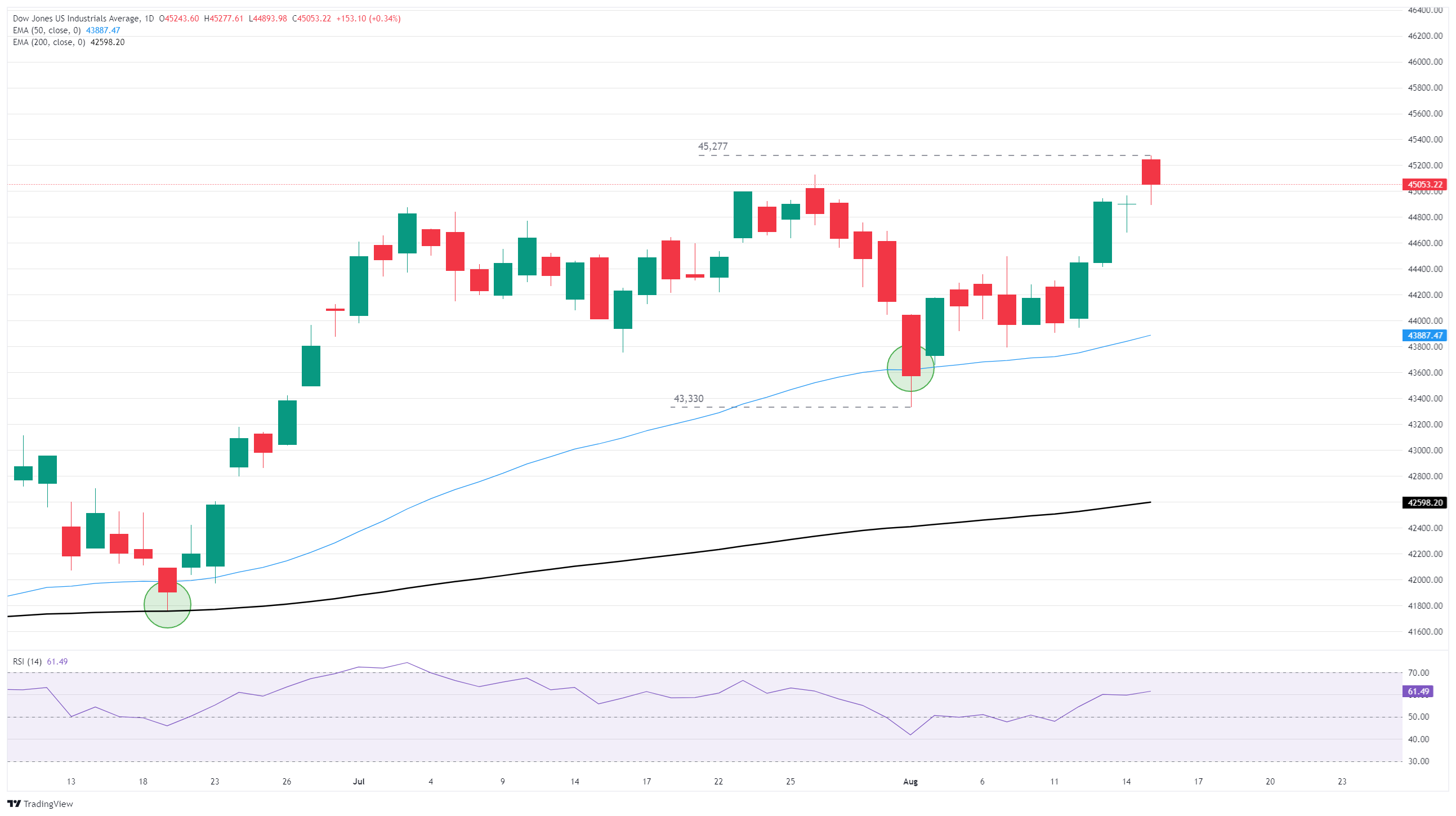 The Dow Jones has tapped in a new all-time high of 45,277 but remains caught in congestion near the 45,000 major handle while rounding the corner into the closing bell. Fundamentals have driven most of the meaningful near-term price action as the Dow continues to drift higher following a technical bounce from the 50-day Exponential Moving Average (EMA) after chalking in the last swing low near 43,330. The 50-day EMA is now providing a technical floor near 43,885, ready to catch any short-term downturns.