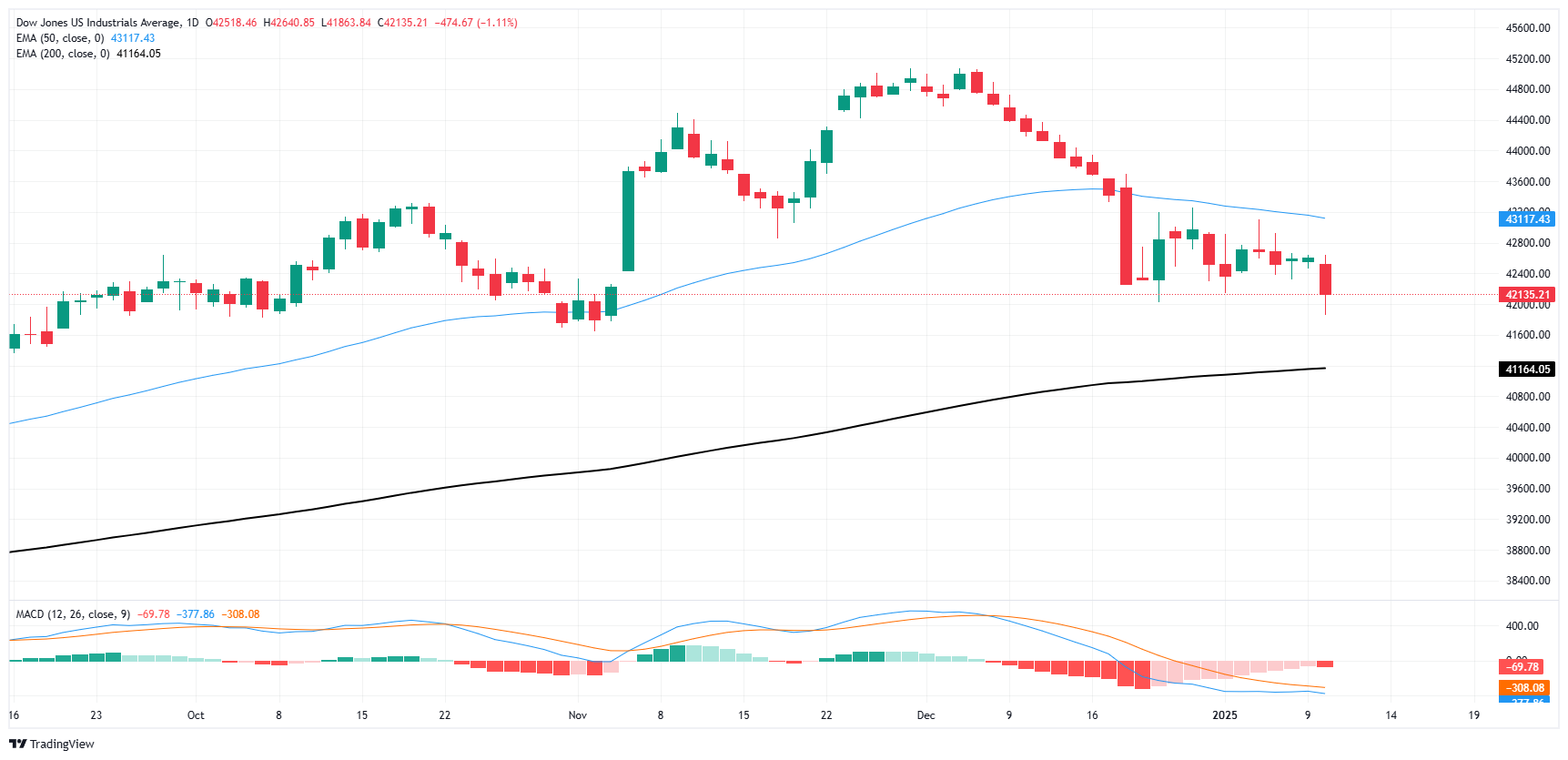 Friday’s post-NFP glut has pushed the Dow Jones within a stone’s throw of the 200-day Exponential Moving Average (EMA) near 41,160. The Dow Jones Industrial Average is poised to close below the 42,000 handle for the first time since early November, and the major equity index is down over 7% from record highs of 45,065 set in December.