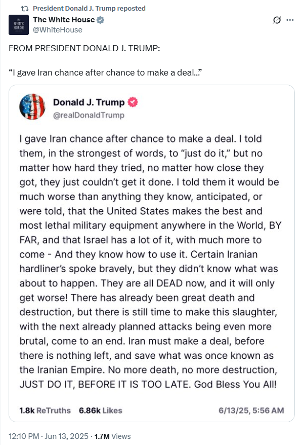 As things stand, the situation remains fluid with Iran at the moment seemingly against the ropes. There are huge questions about whether Iran has been incapacitated by the Israeli strikes which continue. The most recent reports of the IDF bombing the Fordow nuclear plant and other parts of Tehran with no real Iranian resistance thus far.