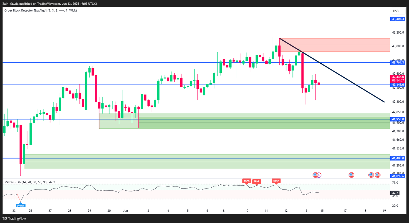 From a technical standpoint, the Dow Index is printing lower highs and lower lows since the high on June 11, around 43132.