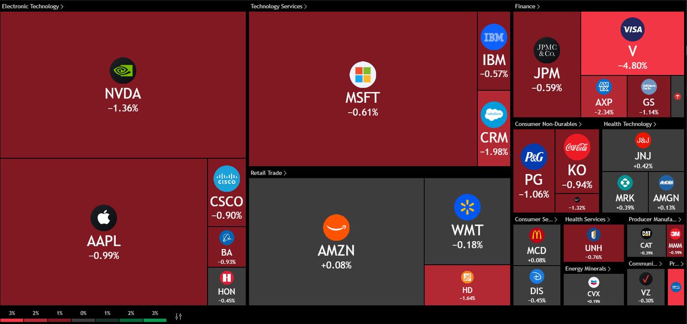 The recovery in the Dow has been held back somewhat by card issuers Visa and American Express which have come under pressure after a report by the WSJ that Walmart WMT.N, Amazon AMZN.O and Expedia Group EXPE.O are among companies exploring their own stablecoins.