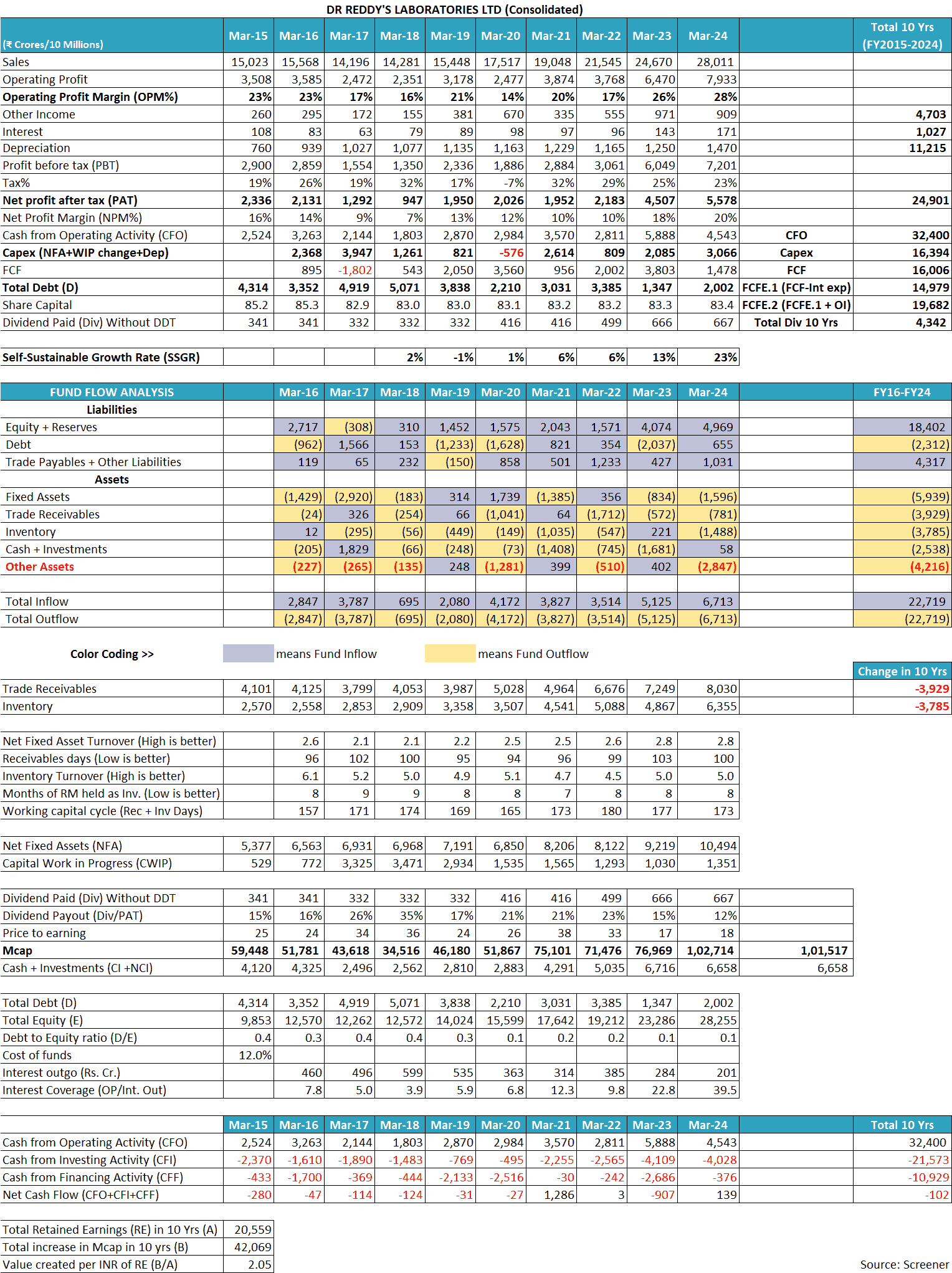 The net profit margin (NPM) of Dr Reddy’s Laboratories Ltd has shown similar fluctuations from 7% to 20% during the last 10 years (FY2015-FY2024).