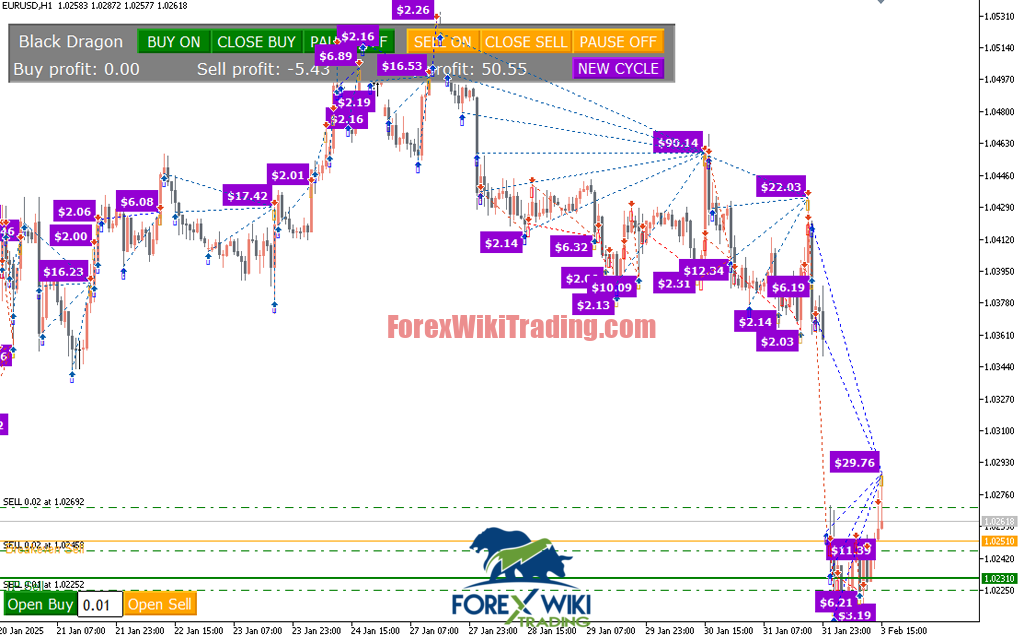 The EA displays real-time profit and loss information directly on your chart, including individual cycle performance, total account profit, and current drawdown levels. This transparency allows you to monitor the EA’s performance at a glance.