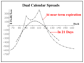 How valuable is it for the profit range to have widened by that much? It’s dependent on the volatility of the underlying, of course, but assuming that XYZ stock has a volatility of 50% in the above examples, here are the probabilities, as calculated by our Probability Calculator 2000: the probability that the stock will finish between 90 and 113 is 44%. The probability that it will finish between 86 and 119 is 58%. Hence the use of the dual calendar spread certainly turns the odds of making a profit in your favor.