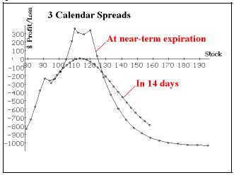 Both spreads have some similar characteristics. First, the risk is the debit paid for the spread – nothing more (of course, it is 100% of the money you invested in the spread, so one must be careful not to over-leverage himself with calendar spreads). Second, when the nearterm option expires (which is the time at which these profit graphs are drawn), the maximum profit occurs if the stock is exactly at the striking price of the options. Third, there is a range within which a profit can be made.