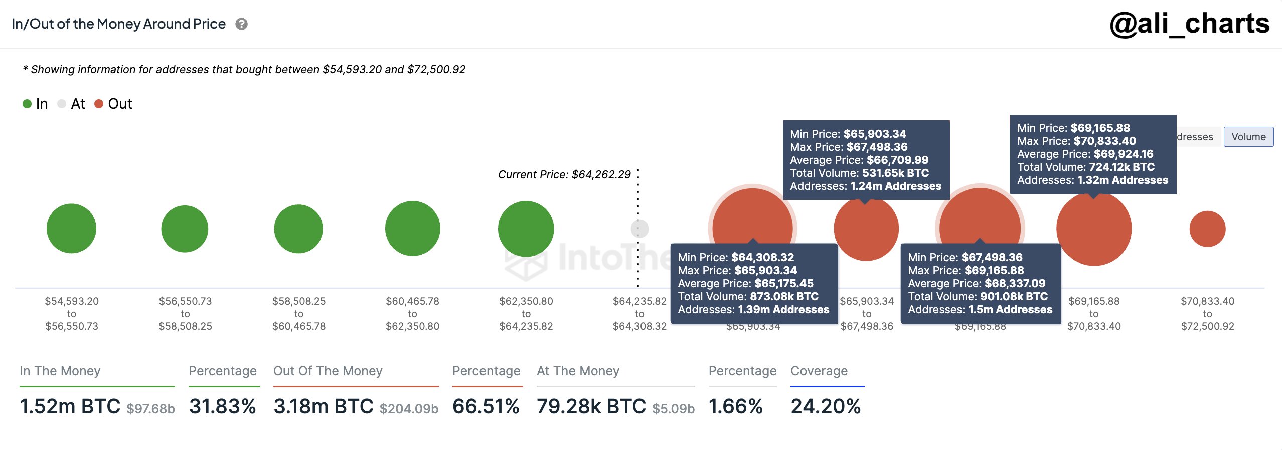 According to IntoTheBlock data, about 5.45 million addresses have accumulated 3.03 million BTC between the range of $64,300 and $70,800. Hence, this large concentration of Bitcoin at high prices forms a significant supply barrier. If the Bitcoin price continues to drop, these holders or dumb money traders might sell to limit their losses. This could eventually intensify the downward pressure.