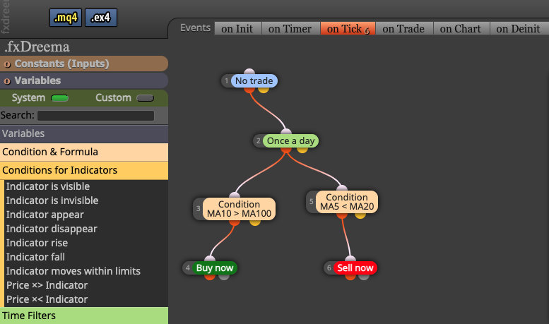 fxDreema is an interesting offering because it solves no-code EA building in a much different way than the other solutions on this list.