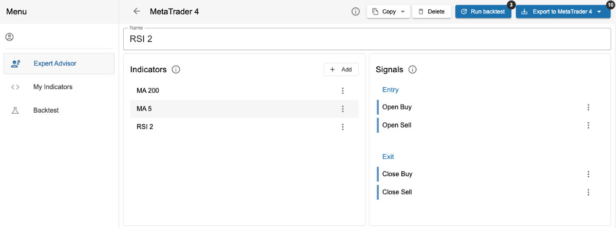 Once a strategy is built in this software, it can be exported to MetaTrader or Forex Tester for backtesting or even live trading.