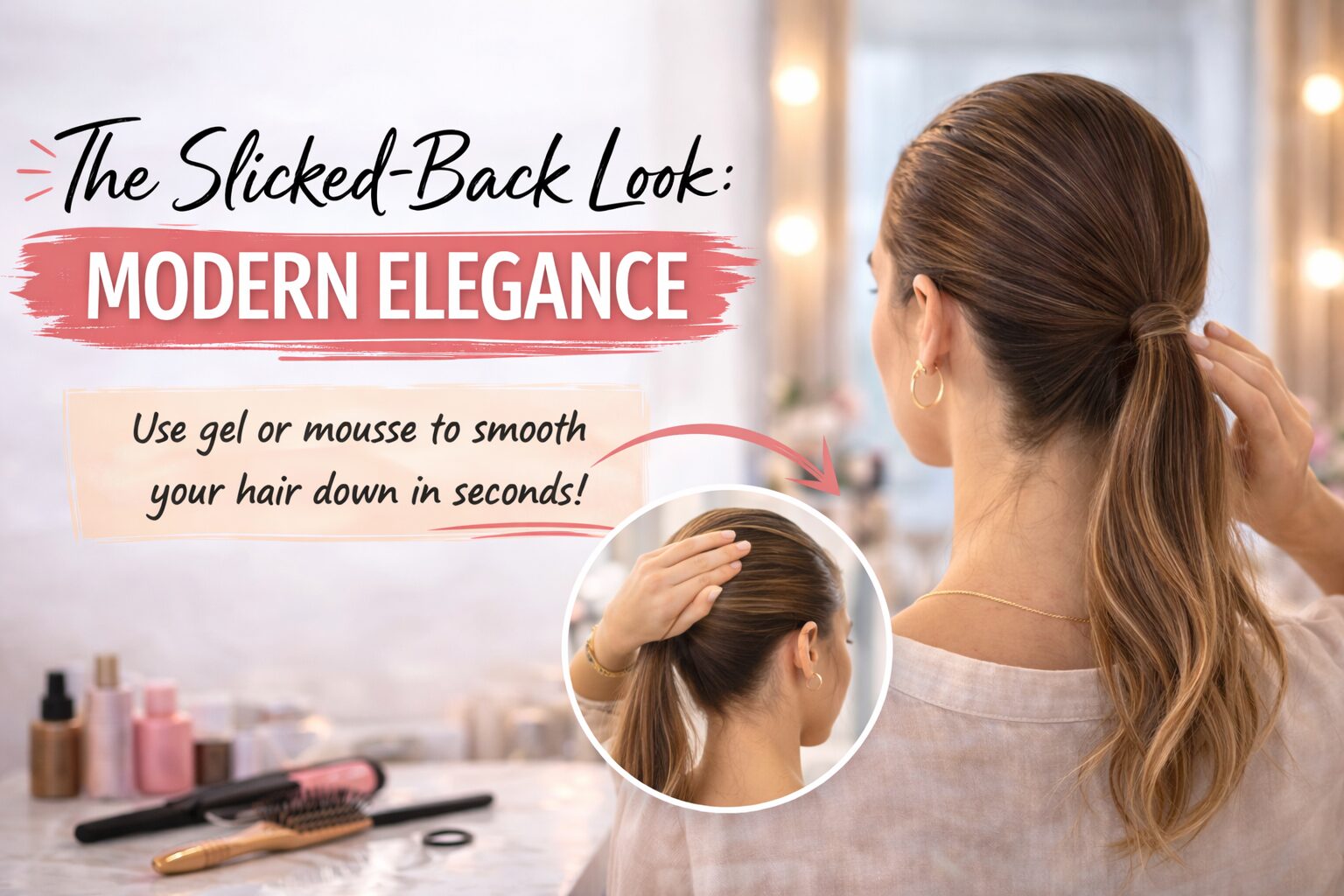For a professional, slicked ponytail, apply gel or serum to smooth out flyaways, then gather your hair into a low ponytail. This simple, elegant style is perfect for work or interviews.