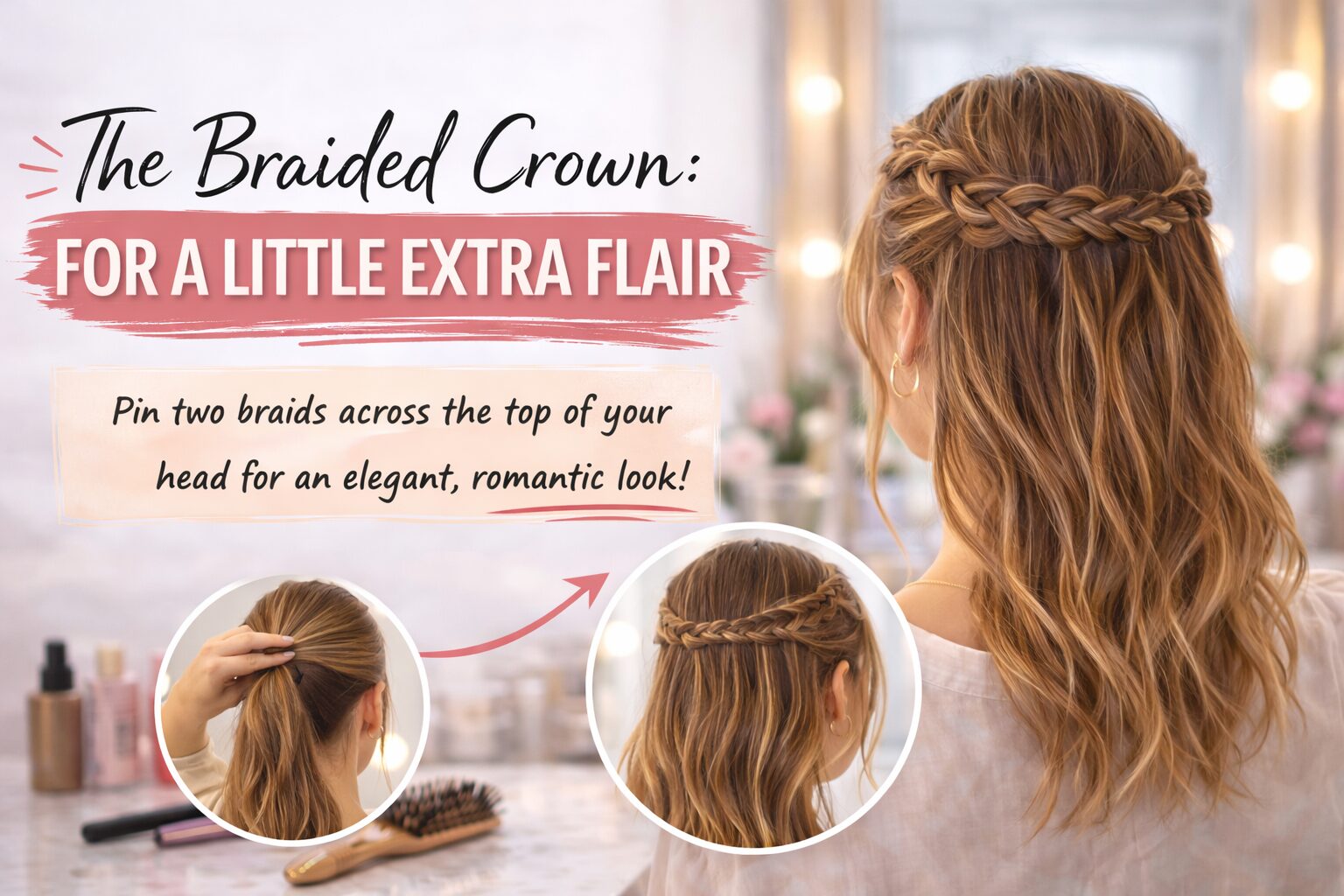 The braided crown is a lovely way to add elegance. Braid two sections of your hair and pin them across the top of your head. This style works for any occasion, adding a romantic touch.