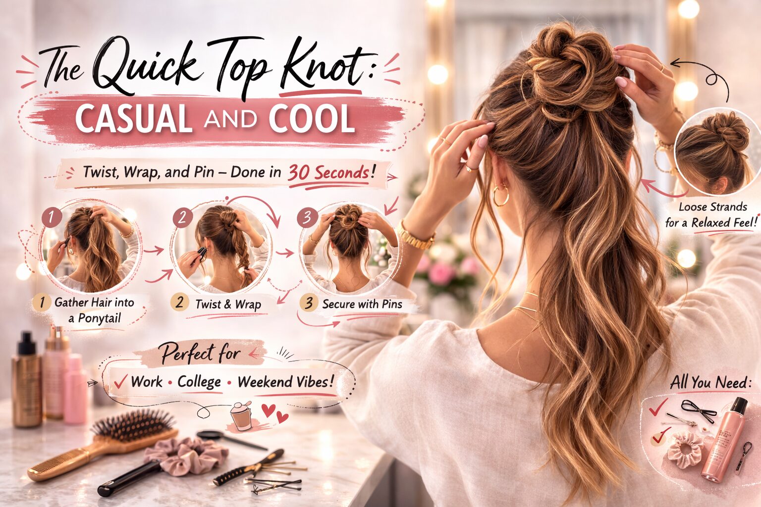 The top knot is perfect for busy mornings. Gather your hair into a high ponytail, twist it into a knot, and secure it with a tie. You’ll look stylish in minutes.