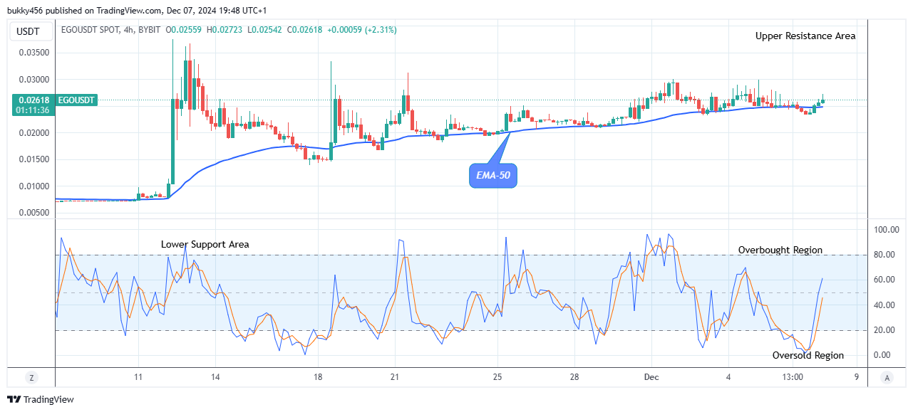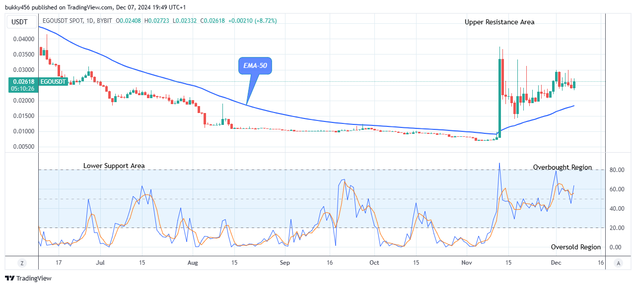 The EGOUSD pair is increasing and forms a bullish pattern, preparing to grow more amidst market fluctuations in its higher time frame. The price is trading above the EMA-50, indicating an uptrend.