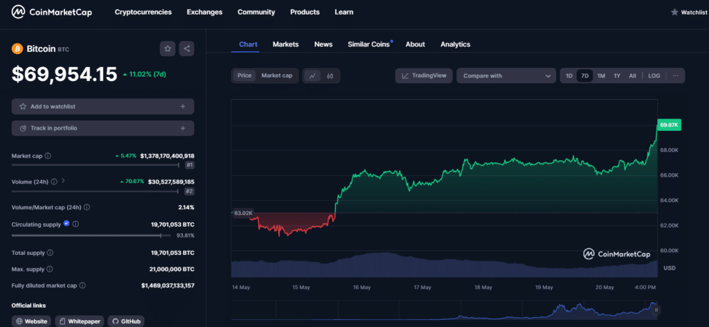 CoinMarketCap data showed a 55% jump in daily trading volumes coincided with a 5% increase in the total crypto market cap, placing the entire market above a $2.5 trillion valuation. The move followed last week’s demand surge of spot Bitcoin (BTC) ETFs, which triggered BTC to rally over 11% in the past week and reached a $69,900 price.