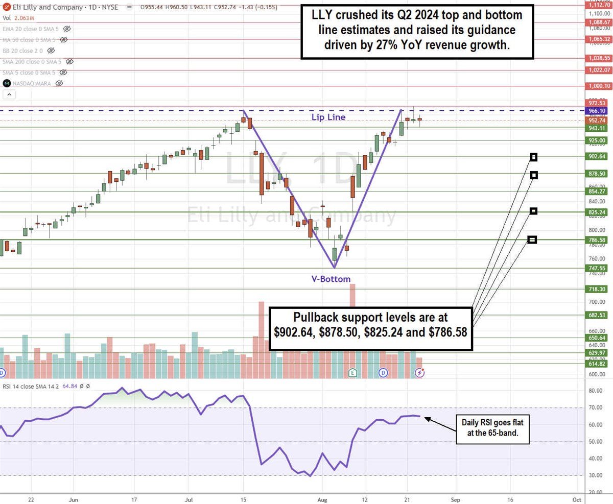 The daily candlestick chart for LLY formed a classic V-bottom pattern. LLY sold off from all-time highs at $966.10 (lip line) on July 15, 2024, to a low of $747.55 on Aug. 5, 2024. LLY surged higher followings its spectacular Q2 2024 earnings release, initially surging 9.5% the following day, rising $73.17 to $845.31. LLY proceeded to claw higher until it retested the lip line on Aug. 20, 2024, and reached a new all-time high at $972.53 on Aug. 22, 2024. The daily relative strength index (RSI) rallied to the 65-band and has gone flat. Pullback support levels are at $902.64, $878.50, $825.24 and $786.58.