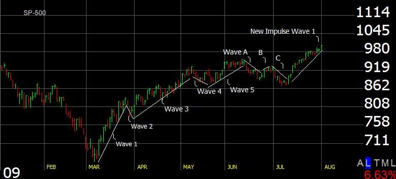 In this chart, I begin with the classic A-B-C correction wave as the market declines and follow it up with the 1-2-3-4-5 impulse wave of the new Bull market that emerged from the ashes of the crash.