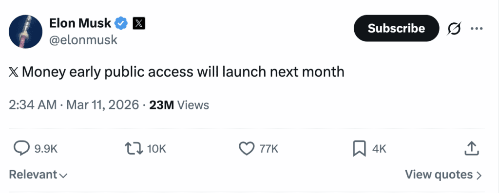 “X Money early public access will launch next month,” Musk posted to X on Tuesday, confirming an April rollout for the payments platform that has been in development, in various forms, for the better part of three years. The announcement landed like a signal flare across the fintech industry — and, predictably, across crypto markets — setting off a fresh round of speculation about what X Money will ultimately become.