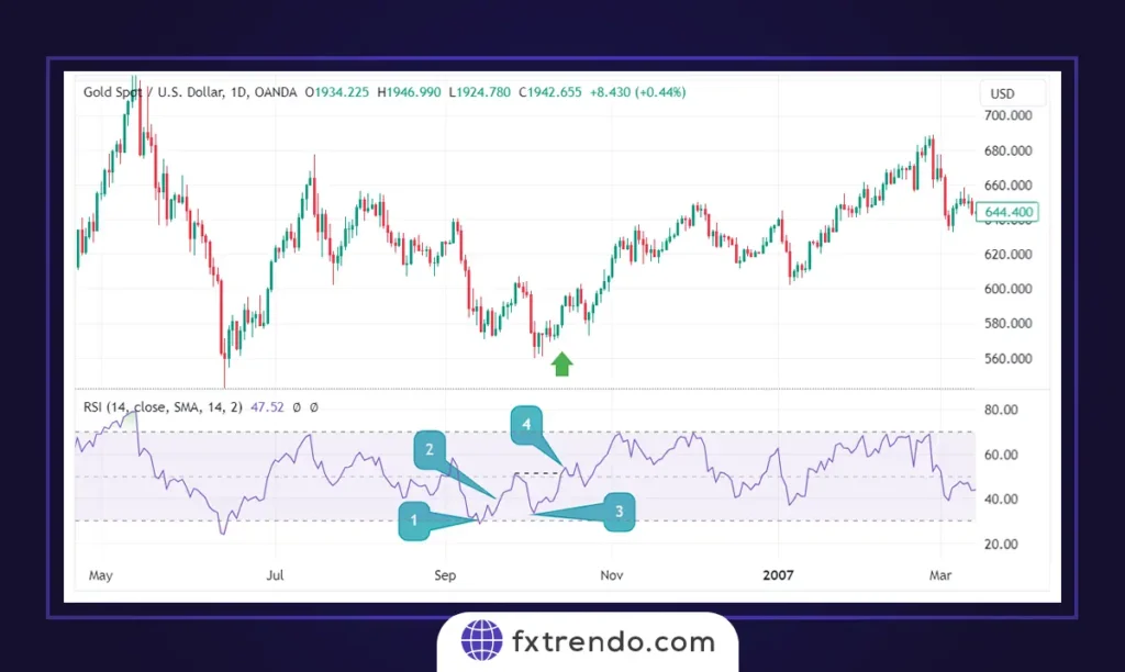In the image below, point 1 indicates that the price has entered the overbought zone, suggesting that buyers in this currency pair are likely losing strength, and a trend reversal is anticipated. Point 2 shows the price reversing from the overbought area. Point 3 illustrates another attempt by the buyers to push the price higher, but point 4 demonstrates strong selling pressure that prevents further upward movement, allowing the sellers to take control of the market.