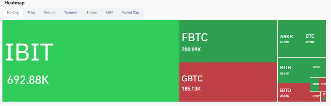 As of press time, BlackRock’s IBIT had the most daily inflows with $692K added. Fidelity’s FBTC followed with $200K gained.