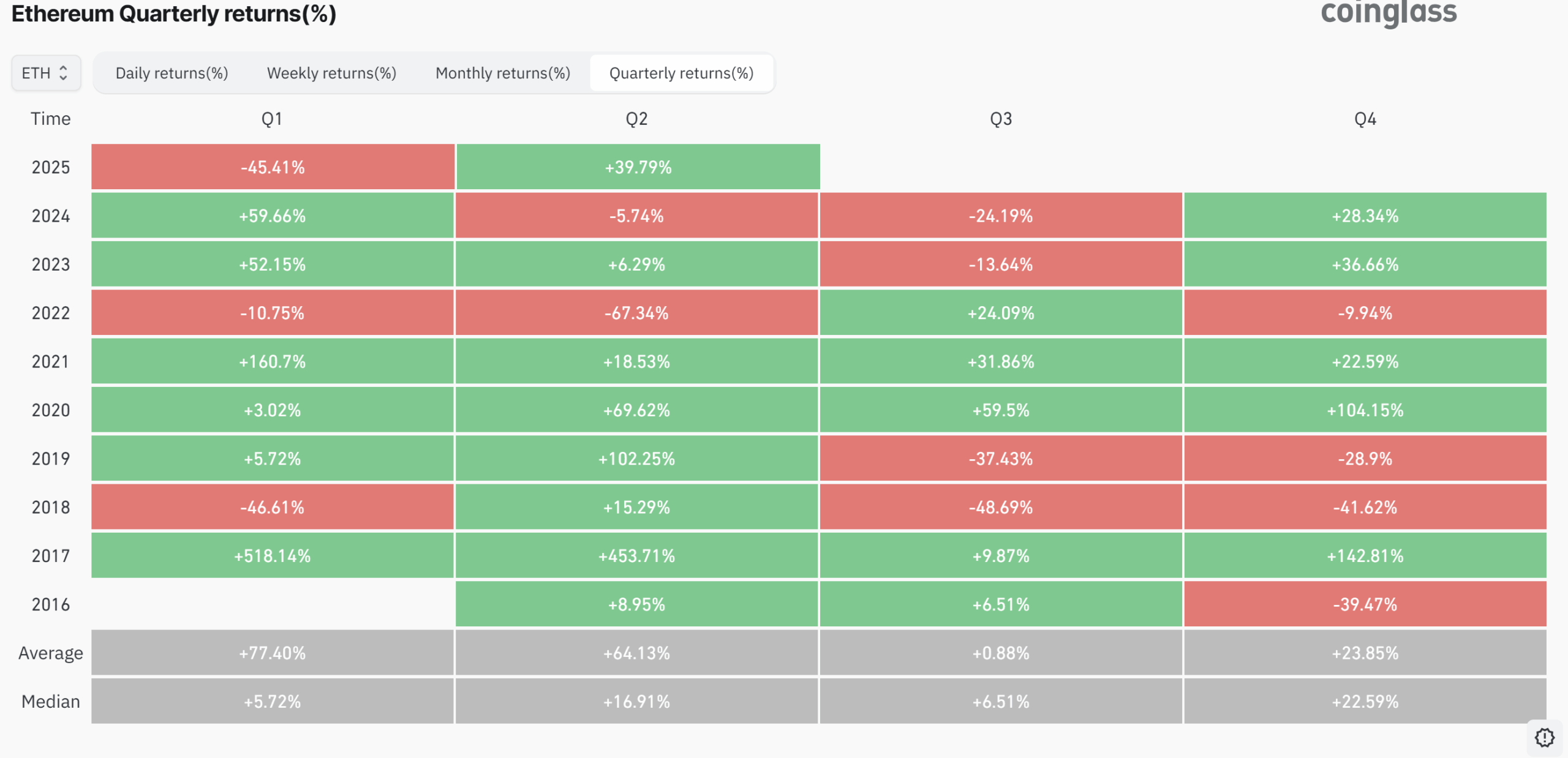 Ether’s historical Q3 performance adds weight to expectations of a potential drawdown period. The altcoin has averaged a modest 0.88% return in Q3, with the prior two quarters showing significant declines of 24.19% and 13.64%, respectively.