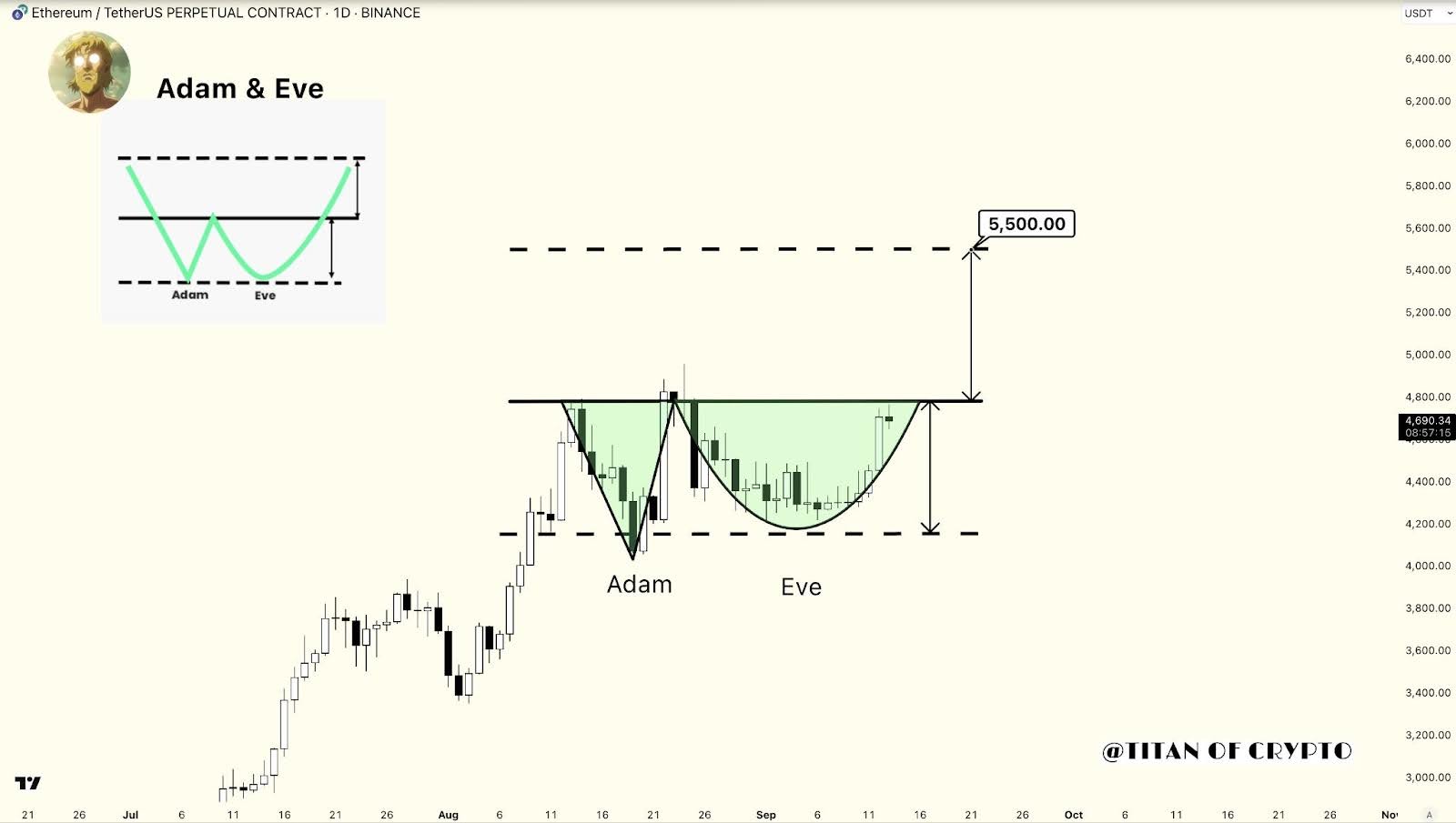 Analyst Titan of Crypto pointed to an Adam & Eve double-bottom pattern on the daily chart.