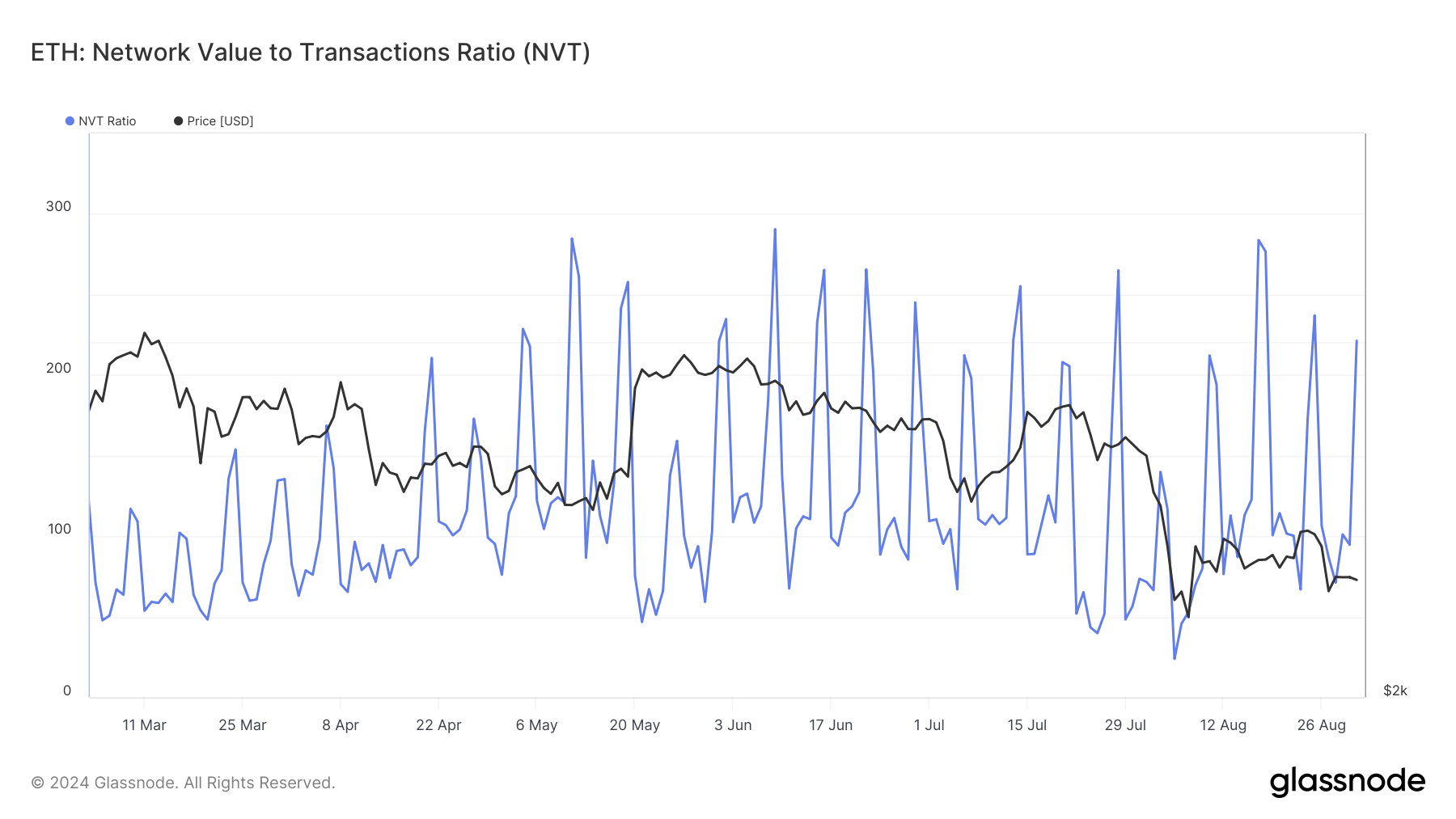 AMBCrypto’s analysis of Glassnode’s data revealed that Ethereum’s NVT ratio registered a massive spike. Whenever the metric increases, it suggests that an asset is overvalued, hinting at a price correction.