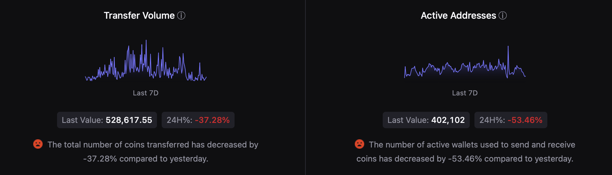 Apart from that, the total number of coins transferred has decreased by -37.28% compared to yesterday. Another bearish metric was the active addresses, as it dropped in the last 24 hours.