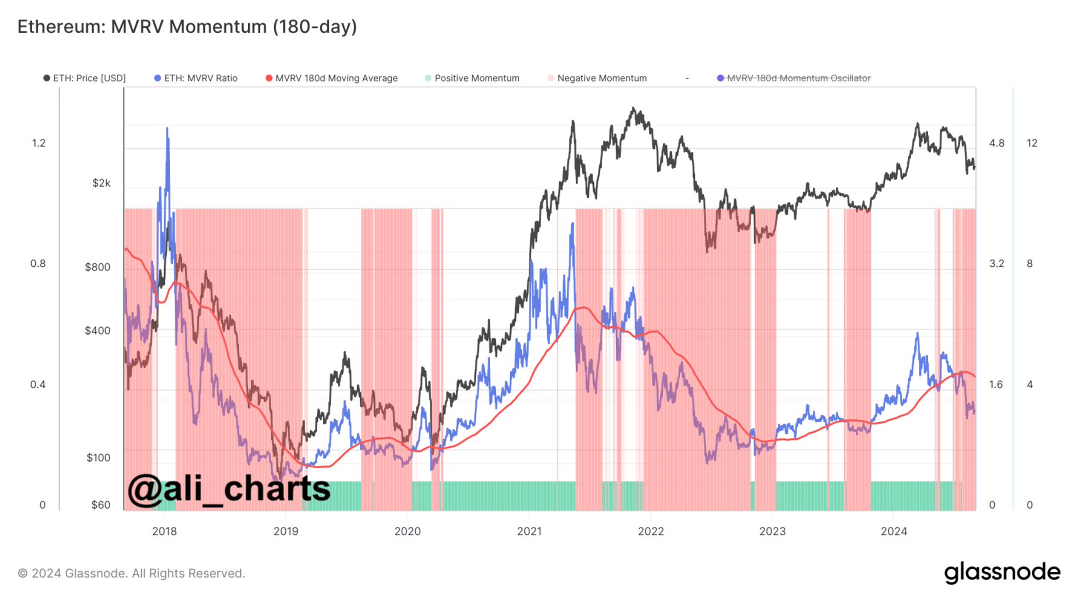 In the meantime, Ali, a popular crypto analyst, posted a tweet highlighting an interesting development. As per the tweet, the MVRV Momentum indicated that Ethereum was still in a downtrend.