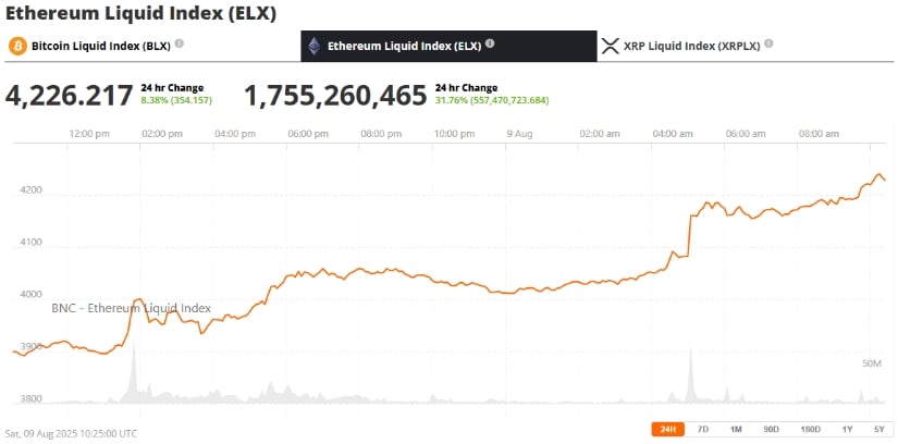 Ethereum (ETH) has been trading at around $4,226, up 8.38 % in the last 24 hours at press time. Source: Ethereum Liquid Index (ELX) via Brave New Coin