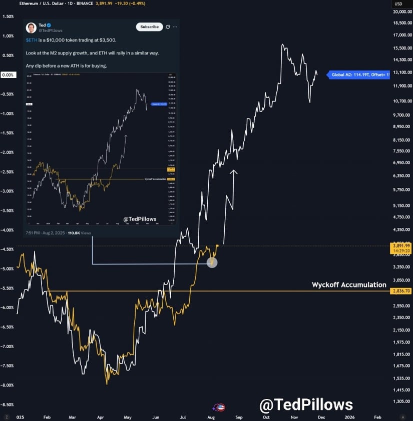 On a broader economic level, macro liquidity trends are also working in Ethereum’s favor. Pillows points to global M2 money supply growth and describes ETH as “a $10,000 token trading at $3,500,” positioning it as a potential hedge against inflation. With rising liquidity in global markets, assets like Ethereum may benefit from the search for yield and protection against currency debasement.