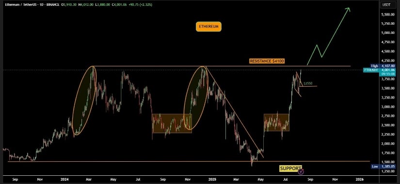 Market analyst Ash Crypto noted on X that “A decisive break above $4,200 could trigger a short squeeze, sending Ethereum quickly toward $4,400–$4,500.” Historically, the $4,200 level has halted advances—most notably in March and December 2024—but this time, momentum appears stronger, supported by higher trading volumes and sustained buying interest.