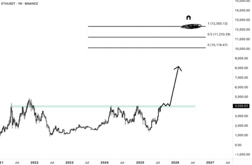 Ethereum is approaching a critical 4-year resistance level, signaling a potential rally that could push prices toward $12,000. Source: @DeFiTracer via X