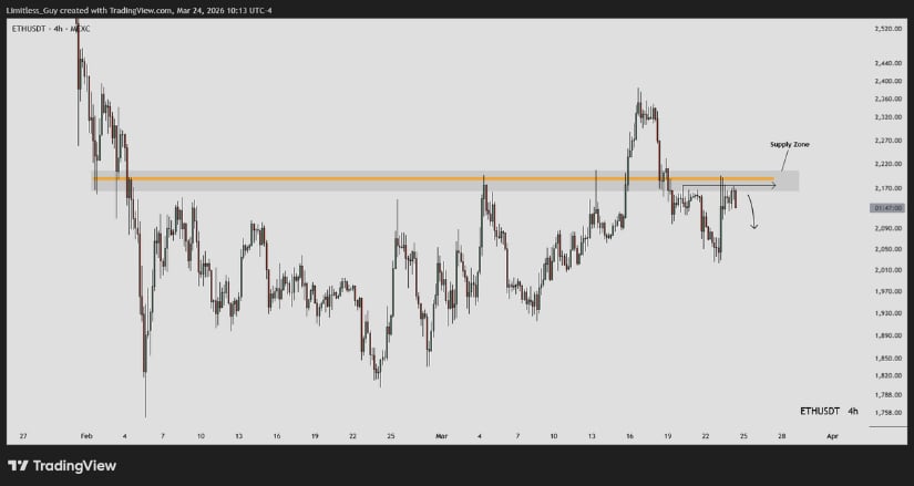 Ethereum faces strong selling pressure near the $2,050–$2,100 supply zone. Source: Pipfessor via X