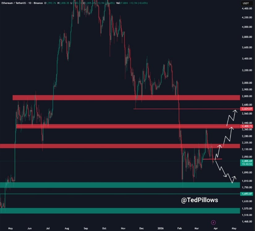 Ted Pillows points out that Ethereum is currently consolidating around the $2,000 level, making it a key pivot for the short-term trend.