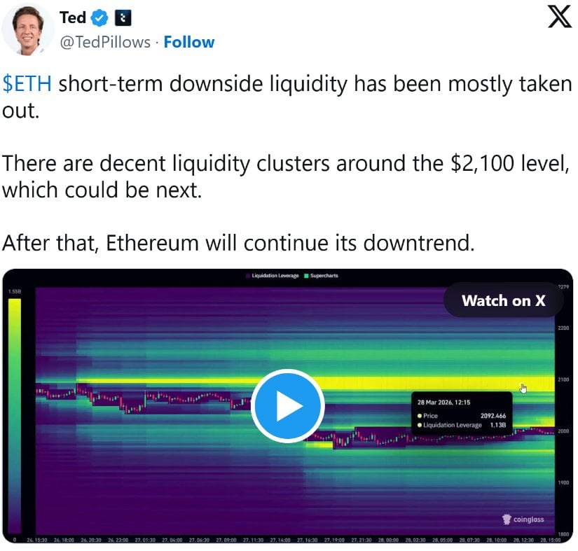 Ethereum may push towards the $2,100 liquidity cluster after downside liquidity is swept. Source: Ted Pillows via X