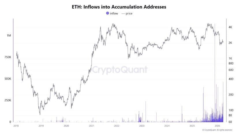 On-chain data shared by CW8900 reveals that Ethereum is experiencing one of its largest accumulation phases since the last major decline. Notably, over 466,000 ETH recently flowed into accumulation addresses, marking a significant spike in long-term positioning.