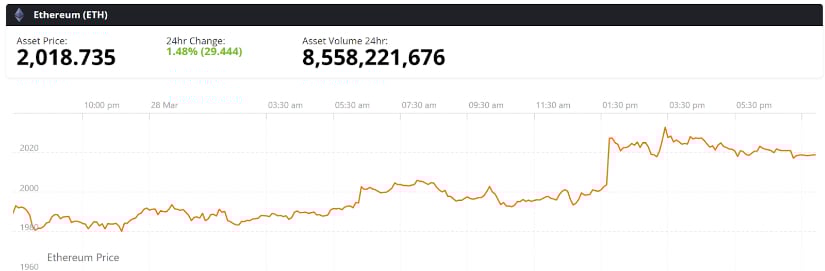 Ethereum was trading at around $2,018, up 1.48% in the last 24 hours at press time. Source: Ethereum price via Brave New Coin