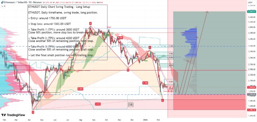Daily ETHUSDT swing trade: entry $1,750, stop $1,383, with staged targets at $3,000, $4,200, and $6,000 using trailing stops. Source: Jasmine-Flower on TradingView