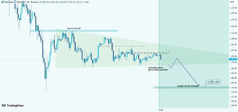 ETH is consolidating near $1,977 within a symmetrical triangle, with a potential breakdown below $1,900 signaling a measured move toward $1,781. Source: melikatrader94 on TradingView