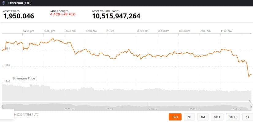 Ethereum was trading at around $1,950.046, down 1.45% in the last 24 hours at press time. Source: Ethereum price via Brave New Coin