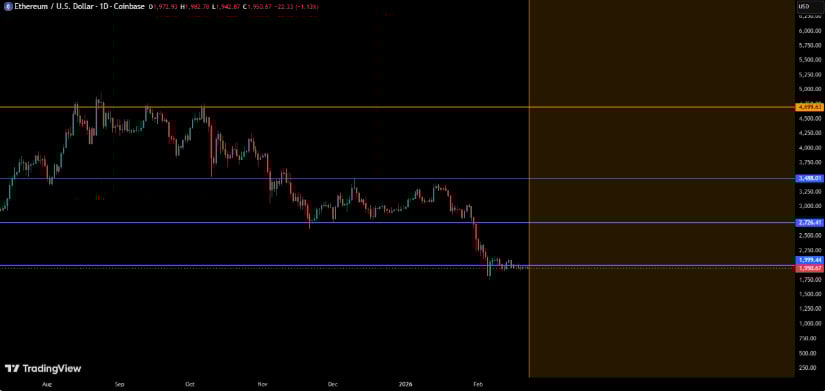- Resistance: ETH faces hurdles between $1,999–$2,050. Only a sustained move above $2,100 would signal a potential bullish shift.
