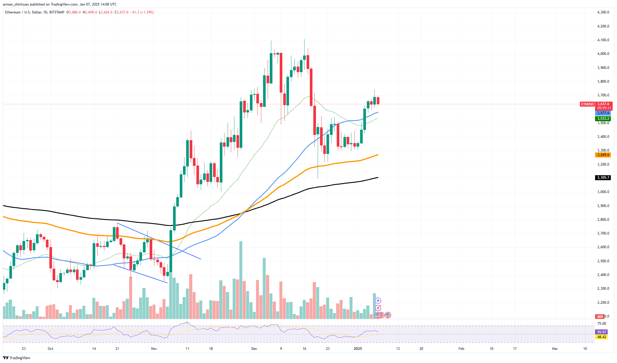 The Relative Strength Index (RSI) is trending in the neutral zone of 55, which is significant despite the volume increase. This implies that there is still potential for ETH to rise without reaching an overbought situation. Ethereum has solid support at $3,500 on the downside, supported by the 26 EMA as well as the recent spike in buying activity. It might offer a strong foundation for the rally’s subsequent leg if this level holds.