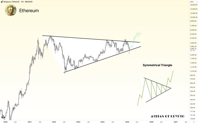 In light of waning performance, seasoned technical analyst and trader Titan of Crypto has outlined a promising trend for Ethereum in the short term. The expert’s analysis shows that ETH’s price action remains strong citing a bullish chart pattern, particularly the Symmetrical Triangle formation.