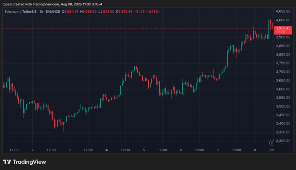 Ethereum (ETH) is trading at $3,953 on the one-week chart. Source: ETHUSDT on TradingView