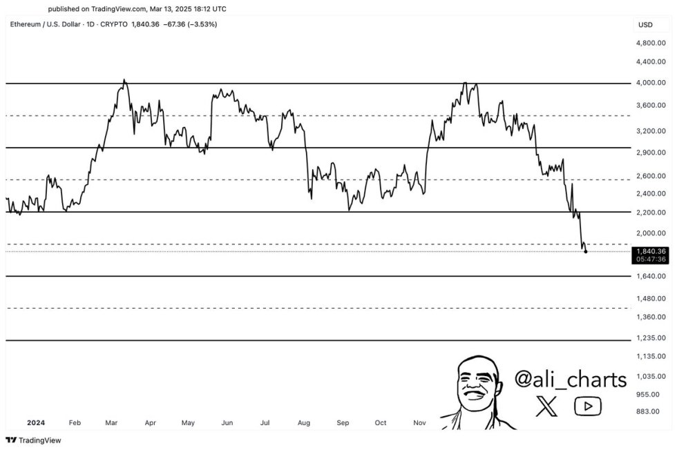 According to a recent post on X by crypto analyst Ali Martinez, Ethereum (ETH) may be heading to $1,250 as it risks breaking down from a parallel channel. However, other analysts suggest a trend reversal could be on the horizon for the second-largest cryptocurrency by market cap.