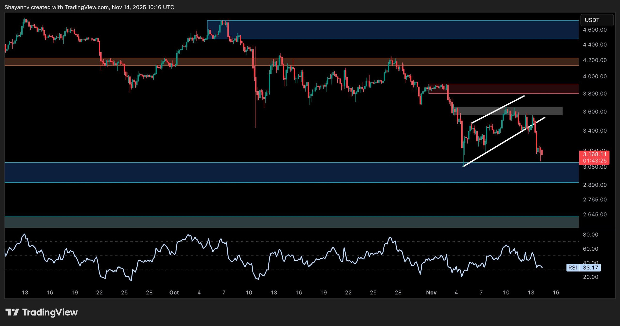 The RSI has also dropped to around 33, which shows bearish momentum but also brings ETH closer to oversold territory. If the asset fails to hold above $3,000, the next major support sits around the $2,500 zone, which also aligns with a previous demand area from early Q3. If buyers want to regain control, they need to reclaim $3,800 with strong volume and flip the 100-day and 200-day moving averages again.