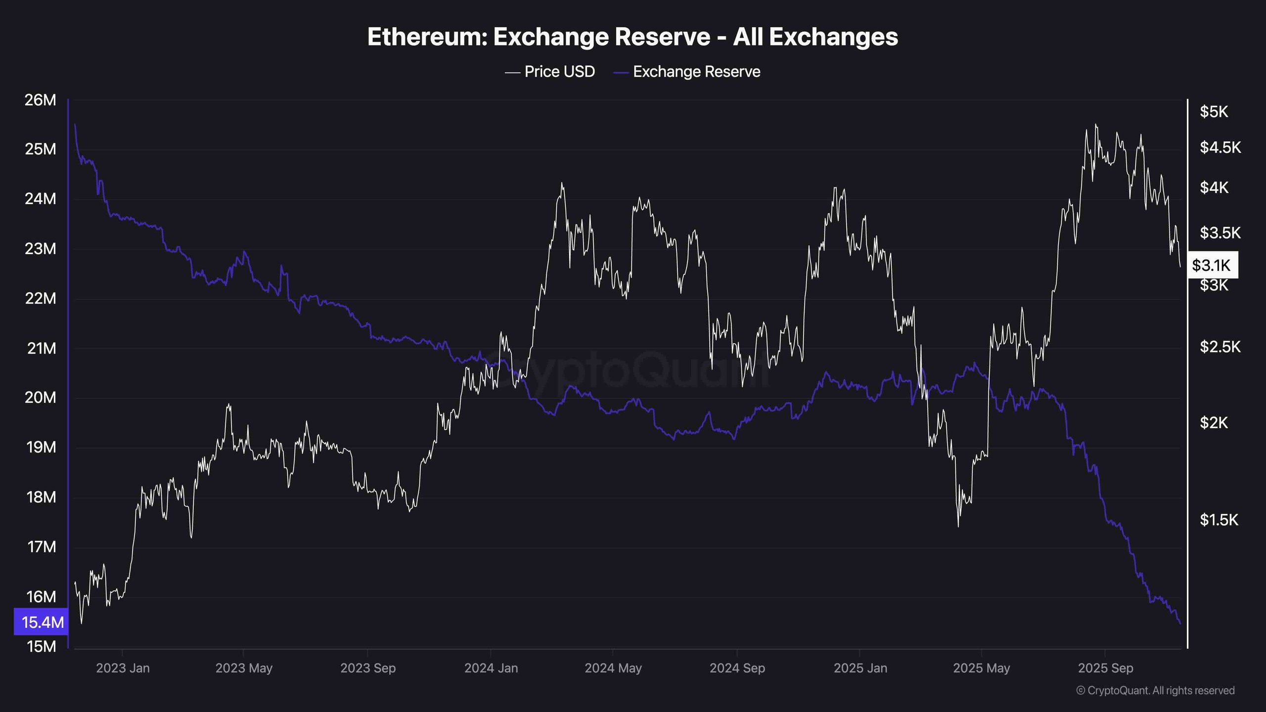 Exchange reserves for Ethereum continue to drop and are now at multi-year lows. With just over 15 million ETH sitting on centralized exchanges, this is a structurally bullish sign over the long run, which indicates a continued trend of accumulation and self-custody.