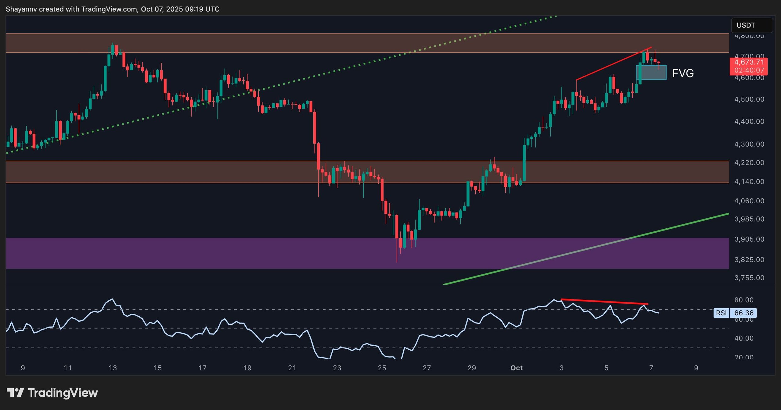The 4-hour chart shows early bearish divergence between price and RSI, indicating weakening momentum as ETH tests the key $4,700-$4,800 resistance zone. Yet, a small bullish Fair Value Gap (FVG) has formed near $4,600, which could attract short-term retracement and support before continuation.